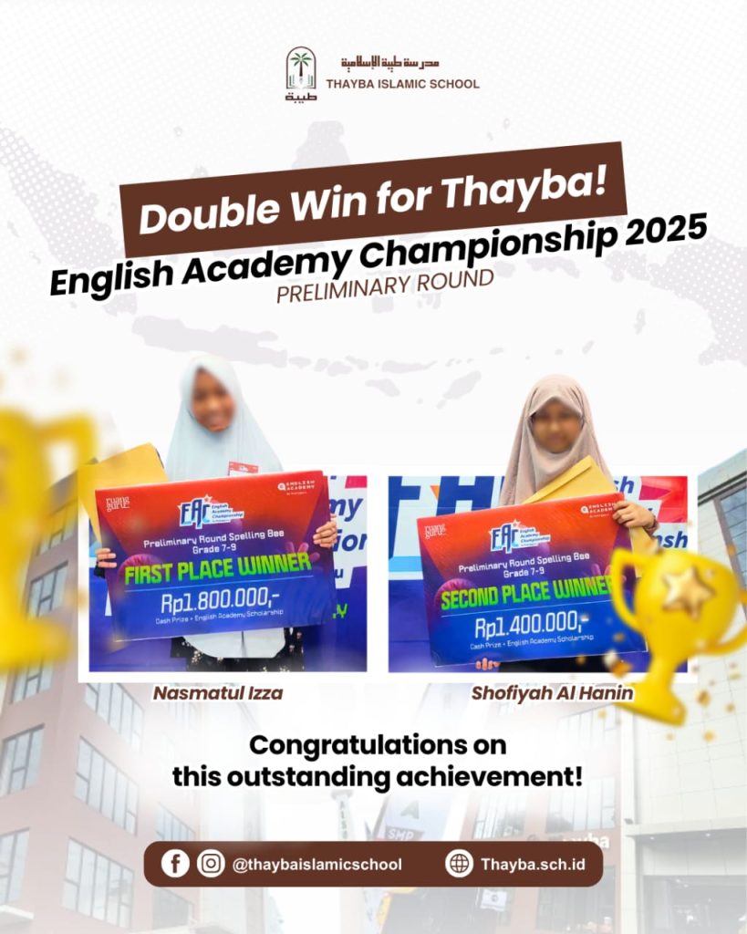 ๐Thayba Claims 1st & 2nd Place in the Preliminary Round of the English Academy Championship 2025๐ Alhamdulillah, two students of SMP Thayba achieved an outstanding accomplishment in the English Academy Championship 2025 under the Spelling Bee category. In the Preliminary Round held on Saturday, 22 November 2025, Nasmatul Izza and Shofiyyah Al Hanin secured 1st […]