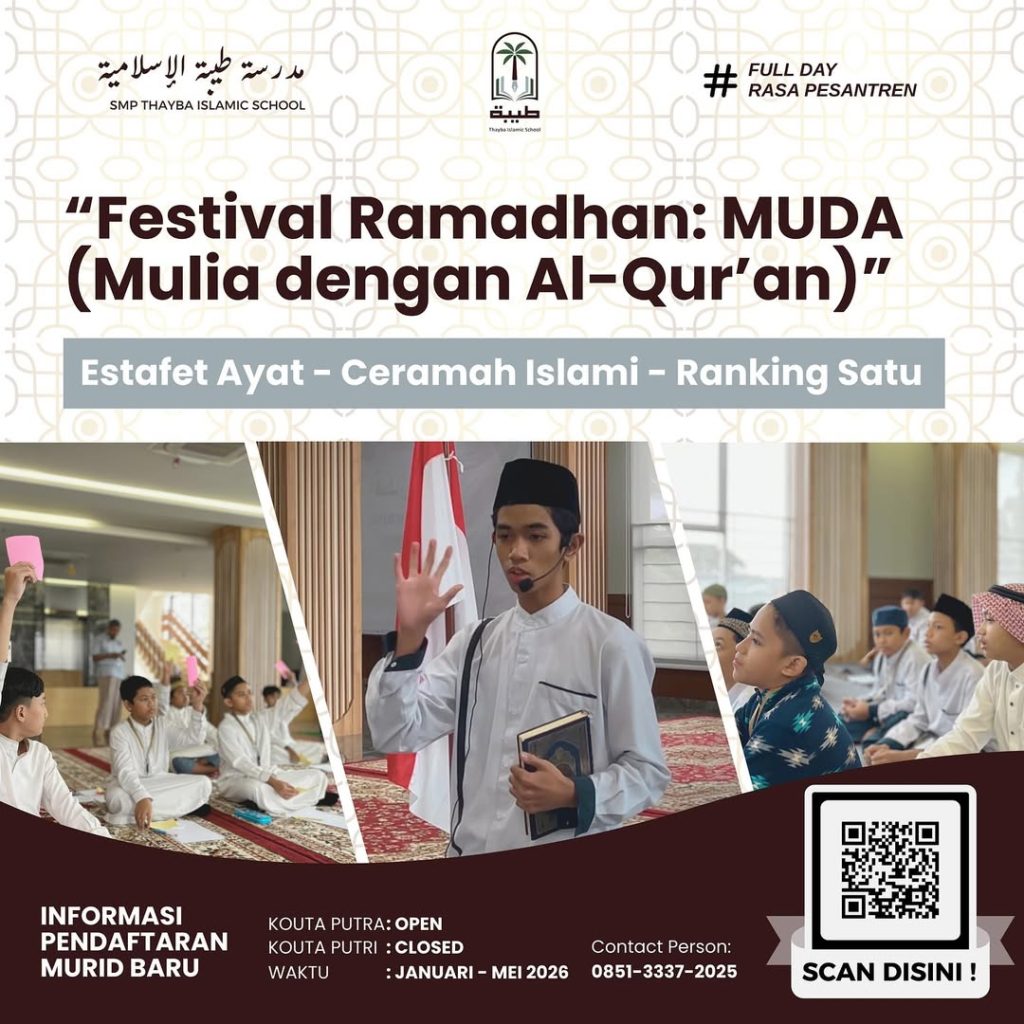 Festival Ramadhan: MUDA (Mulia dengan Al-Qurโan) Sebelum libur akhir Ramadhan, dalam suasana bulan yang penuh berkah, SMP Thayba Islamic School mengadakan Festival Ramadhan selama tiga hari (15โ17 Ramadhan 1447 H / 4โ6 Maret 2025). Festival ini menghadirkan berbagai kegiatan yang memadukan ilmu dan semangat kompetisi, seperti: โจ Estafet Ayat ๐ค Ceramah Islami 3 Bahasa ๐ง […]